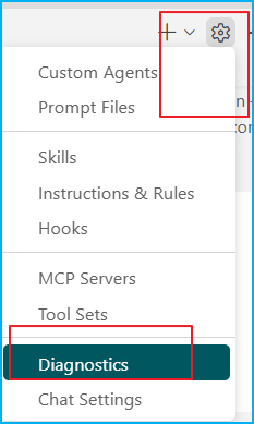 To verify that Copilot is using the correct context, in the Chat view, click the ⚙️ icon (Configure Chat) → Diagnostics. You will see exactly which instructions, prompts, agents, and skills Copilot loaded in that session.